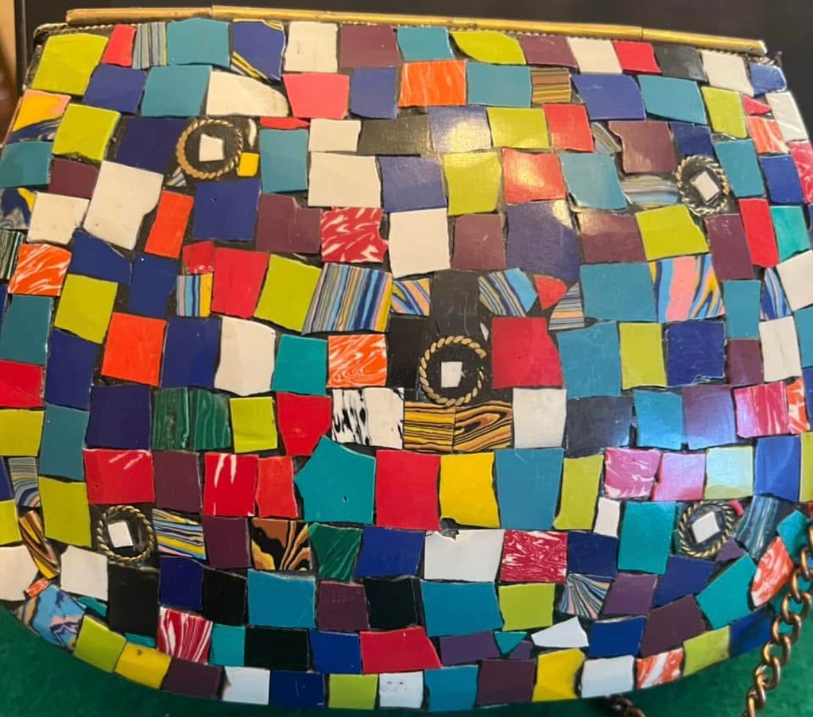 Beautiful Ramla design handmade mosaic crossbody bag. Striking bright colours on the out with black lining. Excellent condition.
