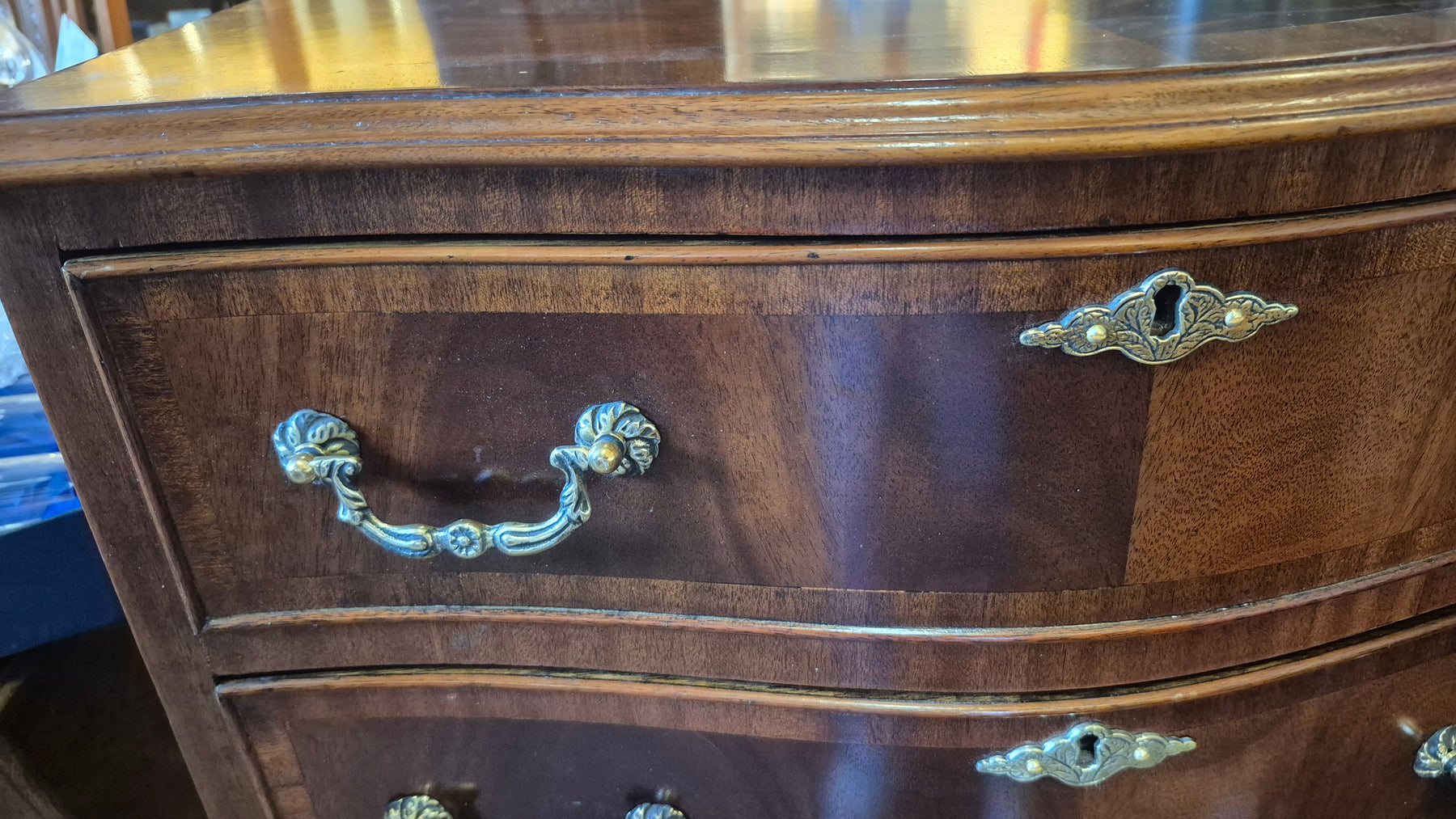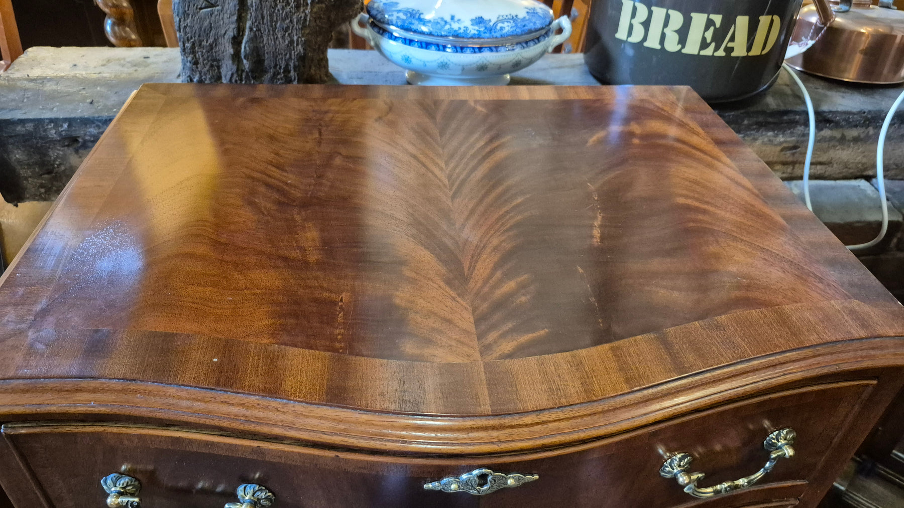 This early 20th-century serpentine chest of drawers is crafted from rich mahogany and features four graduated drawers. It stands on elegant cabriole legs and is adorned with decorative brass drop handles and escutcheons. Expertly restored and repolished, it measures 99 cm high, 66 cm wide, and 46 cm deep, combining refined craftsmanship with practical storage.