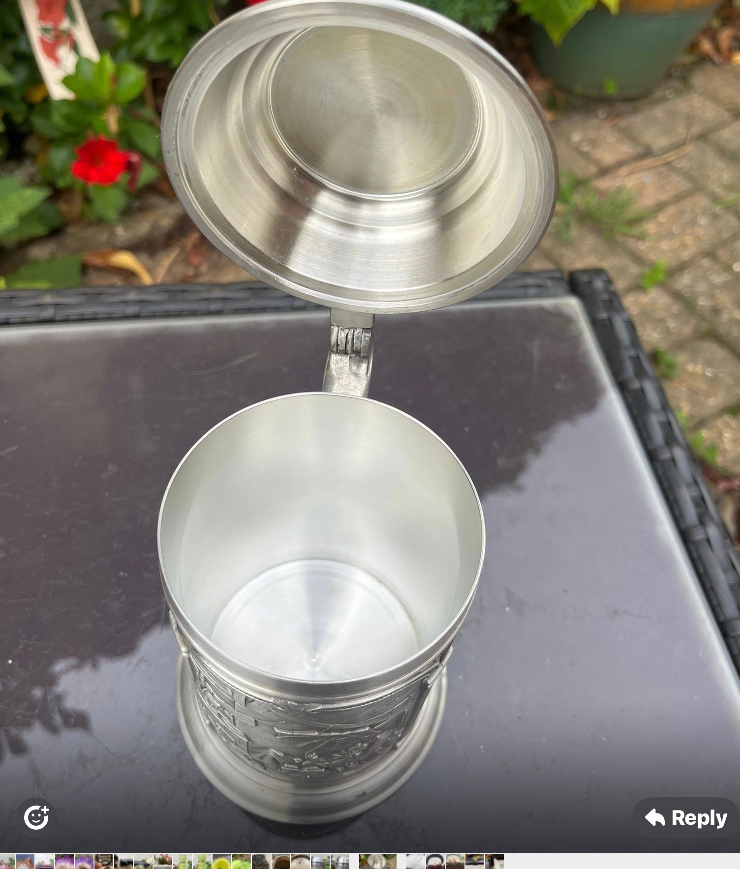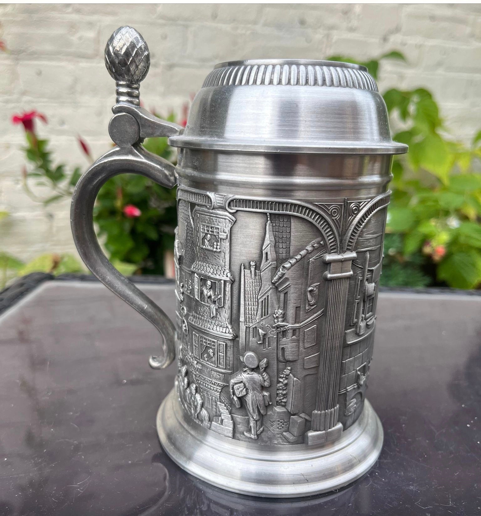 Crafted with precision, this Zinn Becker Stuttgart stein is a testament to traditional German craftsmanship. This 95% pewter Zinn lidded Stein, features intricate detailing commonly associated with fine brewery collectables.